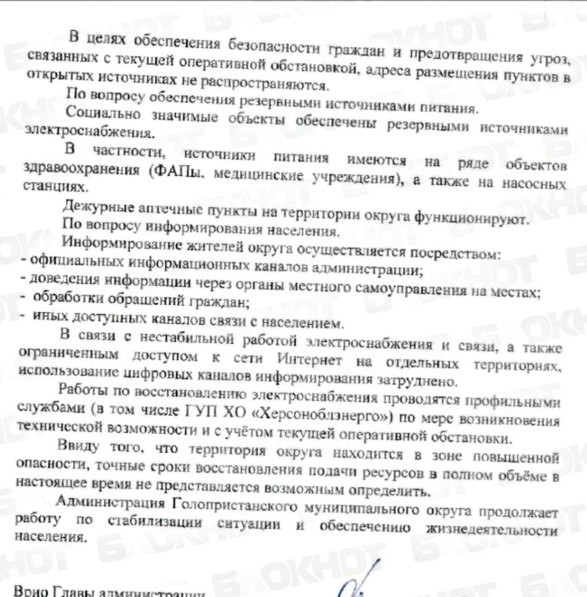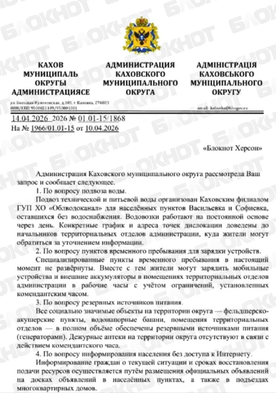 В Каховском округе для ряда населённых пунктов организован подвоз воды через день, графики находятся у местных администраций. В отдельных точках организованы места, где можно зарядить телефоны в рабочие часы. Информация также дублируется на досках объявлений.