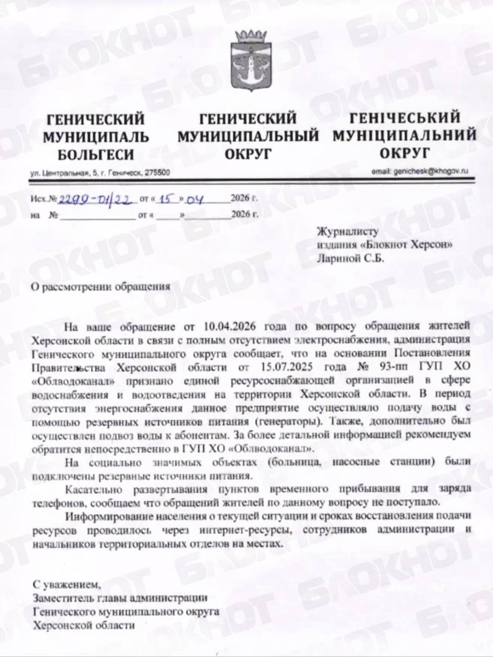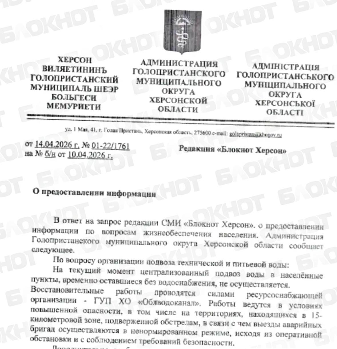 В Геническом округе воду подают с помощью генераторов либо доставляют адресно силами «Облводоканала». Оперативные сообщения передают через теротделы и доступные каналы связи.