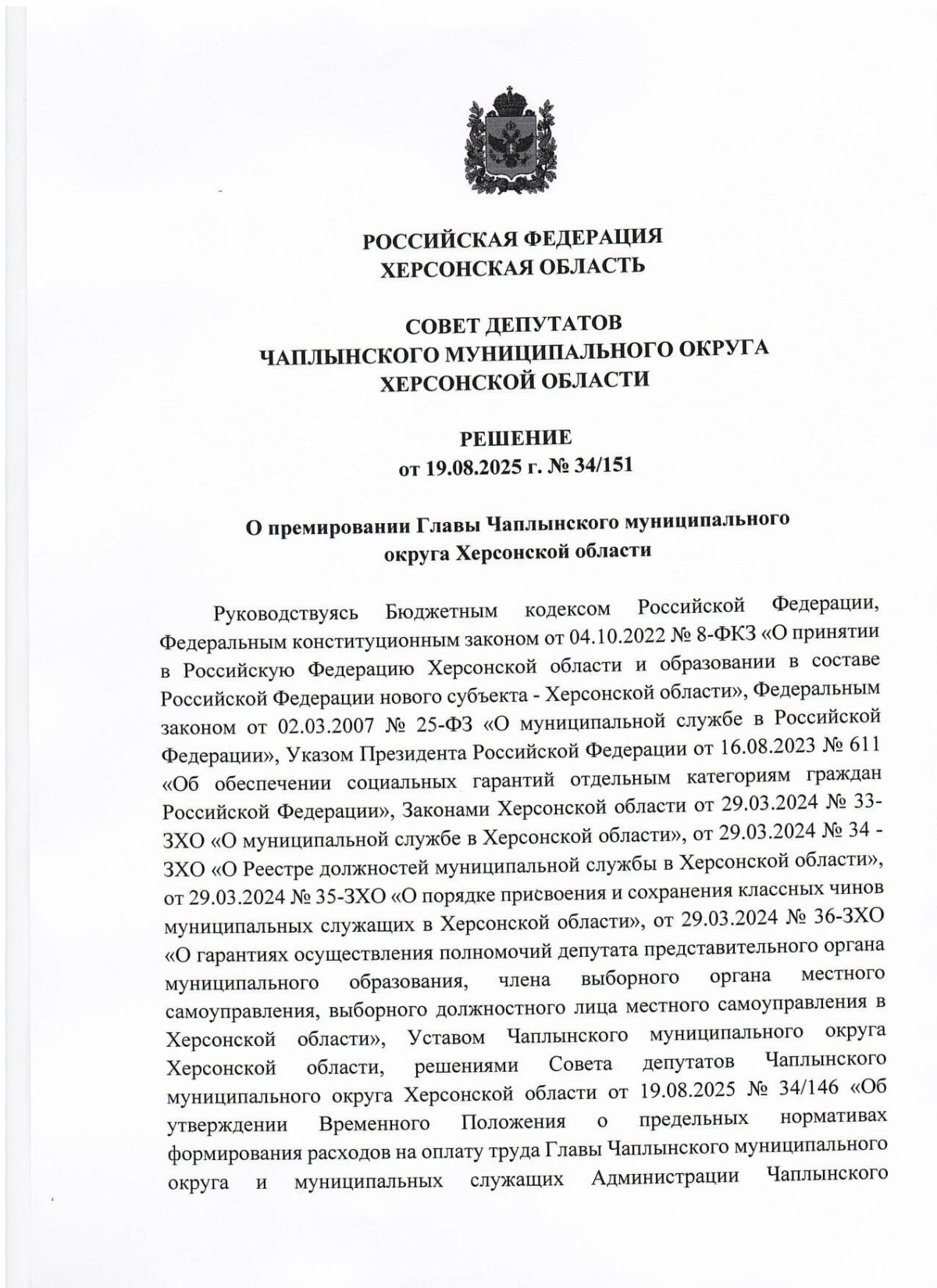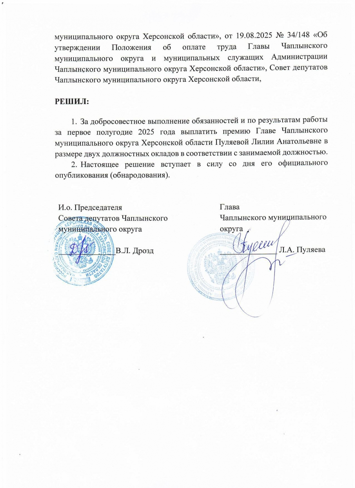 Опубликовано решение Совета депутатов Чаплынского муниципального округа Херсонской области о щедром премировании местной главы Лилии Пуляевой. Она знатно потрудилась в первой половине этого года.